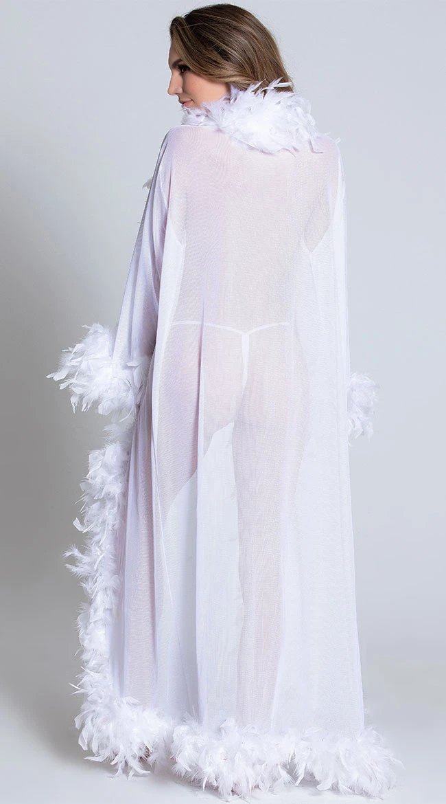 Exude glamour and elegance in this long white robe featuring a lush feathered trim and long sleeves with feathered cuffs. (Robe only.)