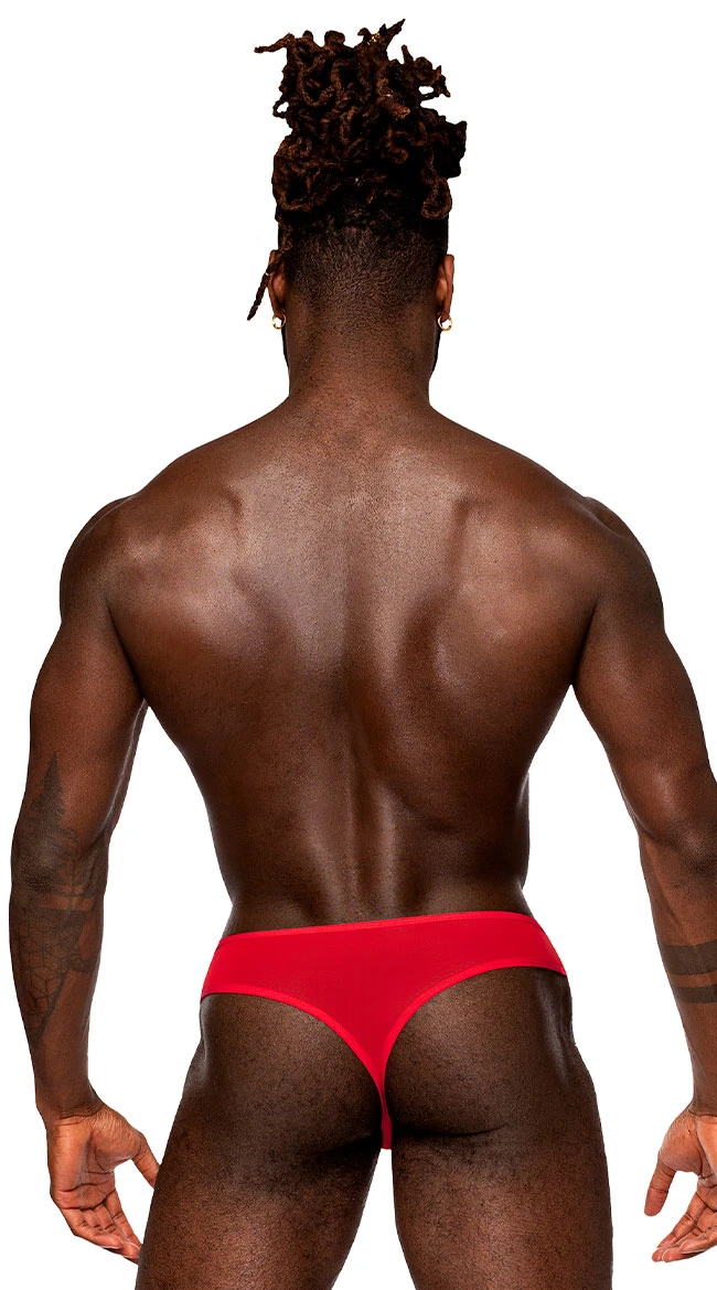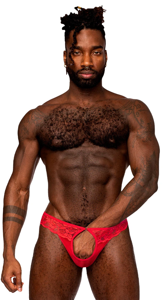 Seduce your lover with this men’s thong featuring a sheer lace waistband, an open crotch, and a sheer mesh back.