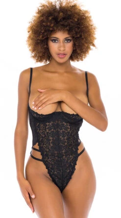 Get ready for a naughty night in this provocative teddy featuring open underwire cups, adjustable spaghetti straps, an adjustable cage style back with hook closures, a sheer floral lace bodice, strappy side panels, and a g-string cut back.