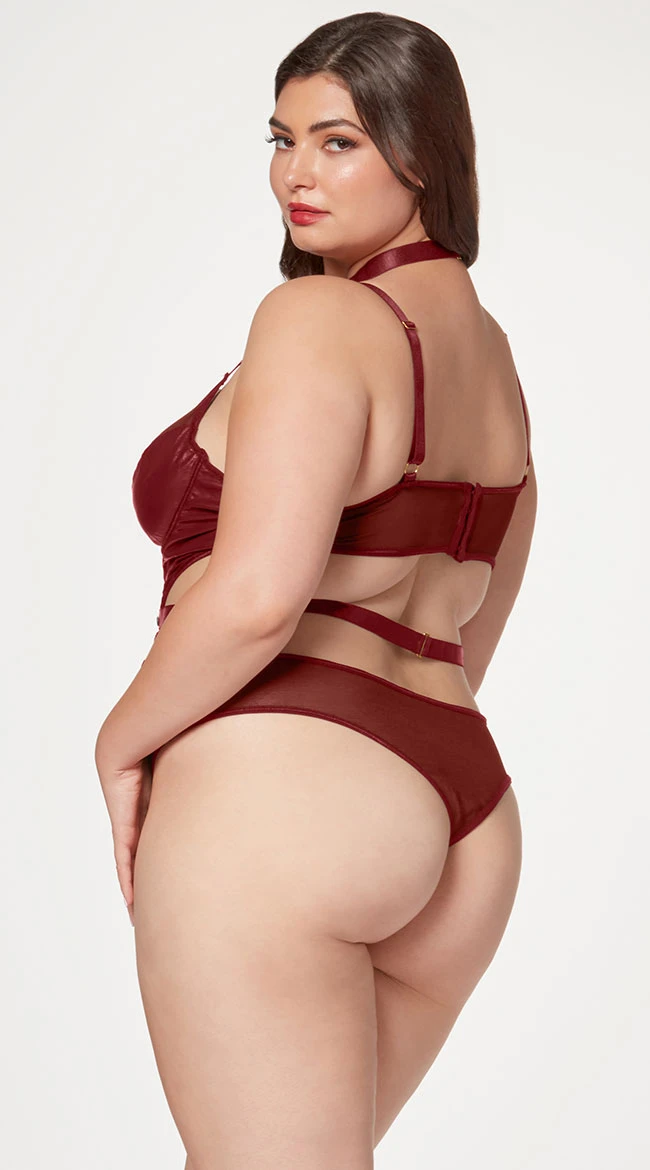 Turn up the sexual edge in this plus size vegan leather teddy featuring soft underwire cups with sheer mesh panels, adjustable spaghetti straps, cut-out sides and back panel, a hook and eye back closure, a high cut leg with a sheer mesh trim, a thong cut back, and a removeable harness with a high choker neckline, O-ring accents, gold stud embellishments, and a back hook closure.